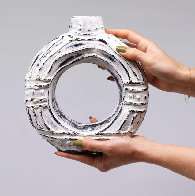 Le vase rond en forme de donut de 23 cm en crème est une version plus compacte du design classique, offrant un choix pratique mais élégant