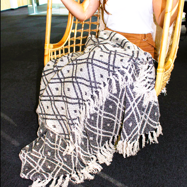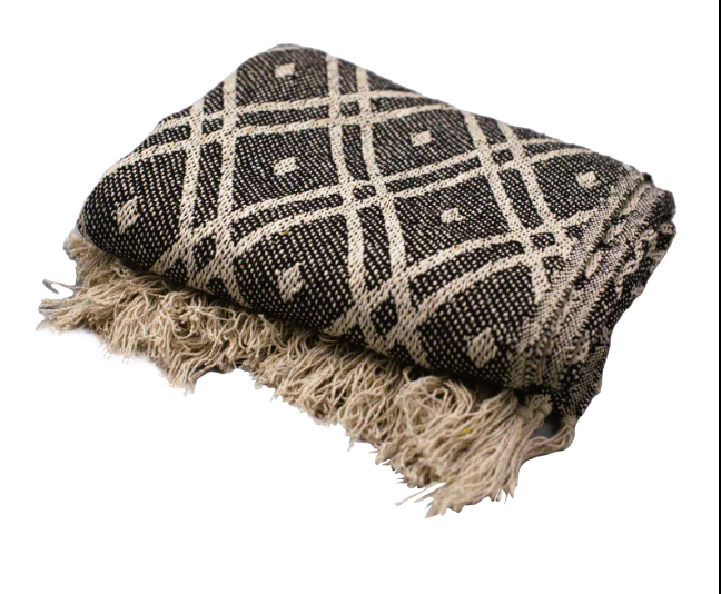 Un plaid chaleureux au style bohème, parfait pour créer une atmosphère douce et accueillante. 125×150 Cm Ce plaid 100 % coton tissé est idéal comme jeté de lit, couverture de canapé ou simple couverture légère.